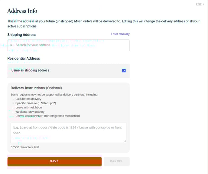 Order already placed? If you've placed an order and need to update the address, please reach out to our friendly customer service team right away at hello@getmosh.com.